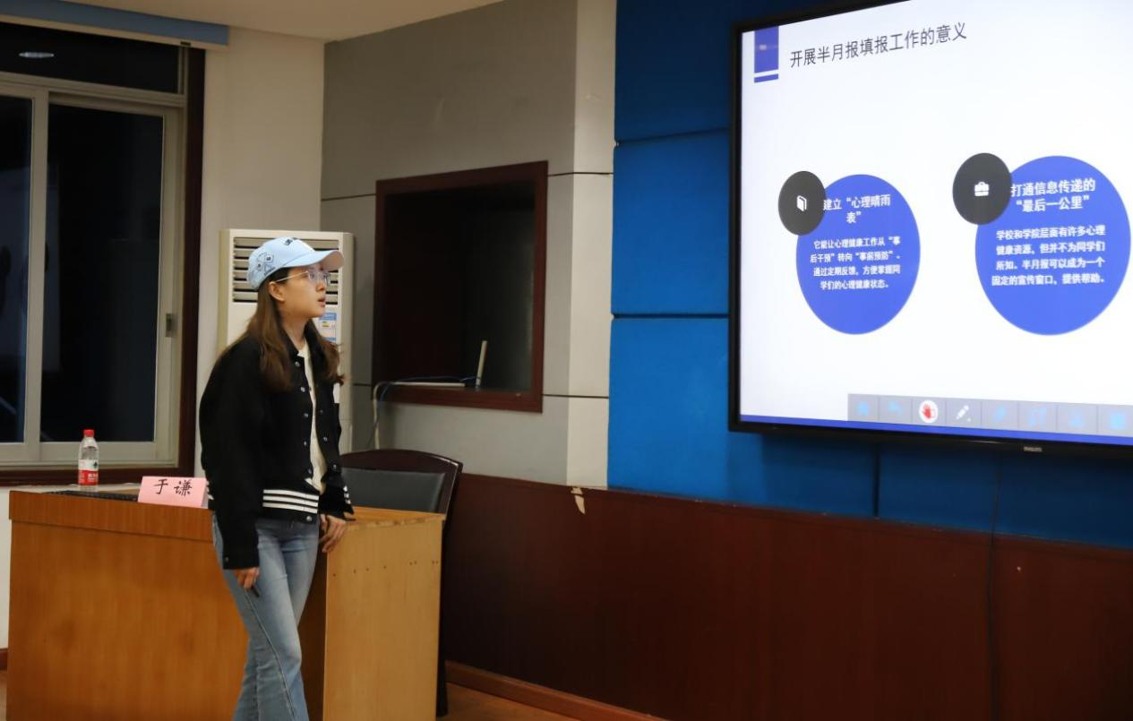 随后,心助会李雨霏同学针对“半月报”的填报流程和注意事项对生心委员进行业务培训,强调生心委员要秉持认真负责、实事求是的工作态度按时完成报送任务。
