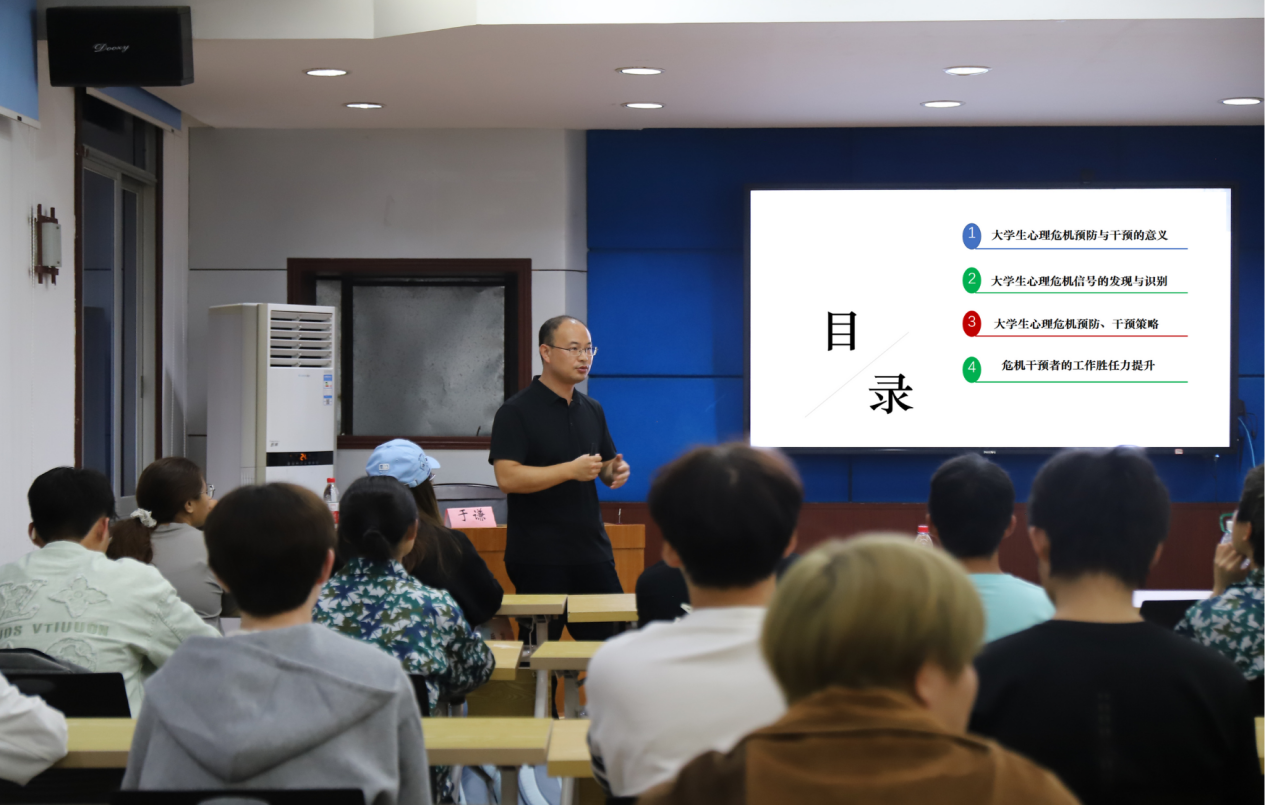 会议伊始,于谦老师以大学生常见的心理问题为切入点,强调朋辈互助的重要意义,并详细解读了危机信号识别、预防与干预策略、应对能力提升方法等,提出要通过构建和巩固好“校-院-班-寝”四级防护体系,筑牢朋辈互助防线,维护校园安全稳定。