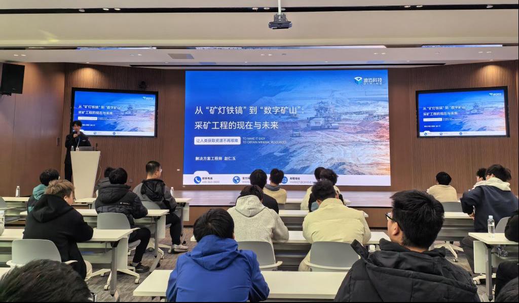在专题讲座环节,迪迈公司解决方案工程师赵仁玉围绕行业现状与发展趋势、企业概况、创新创业基地建设及个人成长路径等内容进行了系统讲解,生动梳理了采矿工程从传统“矿灯铁镐”向现代“数字矿山”演进的技术历程,帮助同学们深刻认识到专业发展的广阔潜力与就业前景。