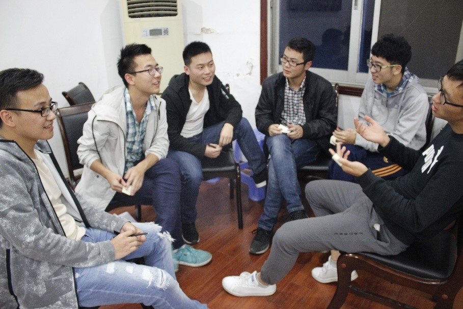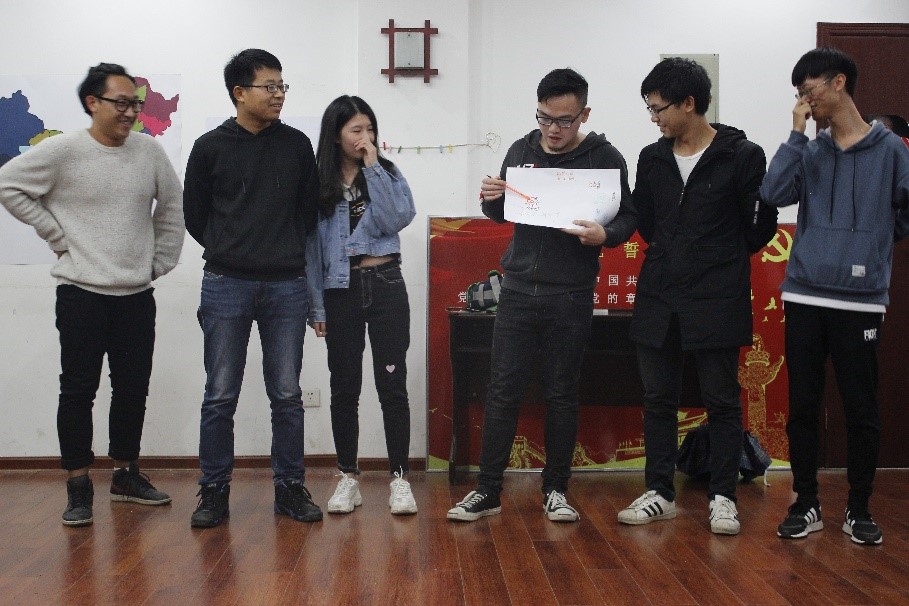紧接着,于谦老师按照座次将参加活动的同学分成四个队,并给15分钟的时间让队员彼此熟悉并为本队确认队名、队号、队歌以及团队契约,每位队员也都积极地出谋划策,最终四个队都想出了富有特色的内容。为了让队员加深了解,于谦老师让每个队比赛“名字滚雪球”游戏,即让队伍站成一排,后一位队员需要说出前面所有队员的城市、爱好以及名字,最终四支队伍按照用时长短得到分数,加上队伍与队伍之间的内投得分即为本队最终得分,得分最高的队伍会获得主办方精心准备的礼物。随后的“解开千千结”游戏环节,帮助参与的同学们体验到互相配合的重要性。当全部24名同学在配合下手拉手回到初始的圆圈状态后,每位同学脸上都洋溢着喜悦。
