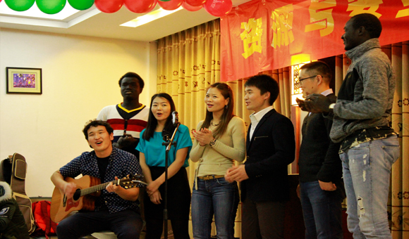 研究生王明虎的吉他弹唱《姑娘》强烈的舞台表现力让大家不由自主地随着歌曲摇摆。本科生田泽同同学的歌曲串烧更将现场气氛推上小高潮。随后,热情的留学生极具异域风情的舞蹈吸引了现场观众与老师共舞。此次晚会不仅节目精彩纷呈,中途还穿插了抽奖与“合力吹气球”、“我是食神”、“你画我猜”等互动游戏环节,活动现场高潮迭起,观众笑声、掌声、喝彩声不断,每个人都沉浸在新年和乐融融的氛围中。最后,所有中外学子与在场领导老师合影留念,为告别2016、走向2017定格下最美的一幕。